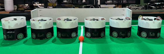 Our team competes in the small size league (SSL) of RoboCup. Here, a team of six robots which are limited to an 18cm diameter and 15cm height compete in a game of 6 on 6 soccer. These robots are autonomously controlled by top-down oriented cameras and wirelessly communicate with each other to defeat their opponents.