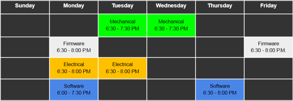 Our training schedule for each discipline is shown below. For Fall 2025, new member trainings start on the 15th of September, and new members can attend either of the meeting times listed for the discipline(s) they are interested in. Trainees only need to attend one meeting each week, as both meetings are identical each week.